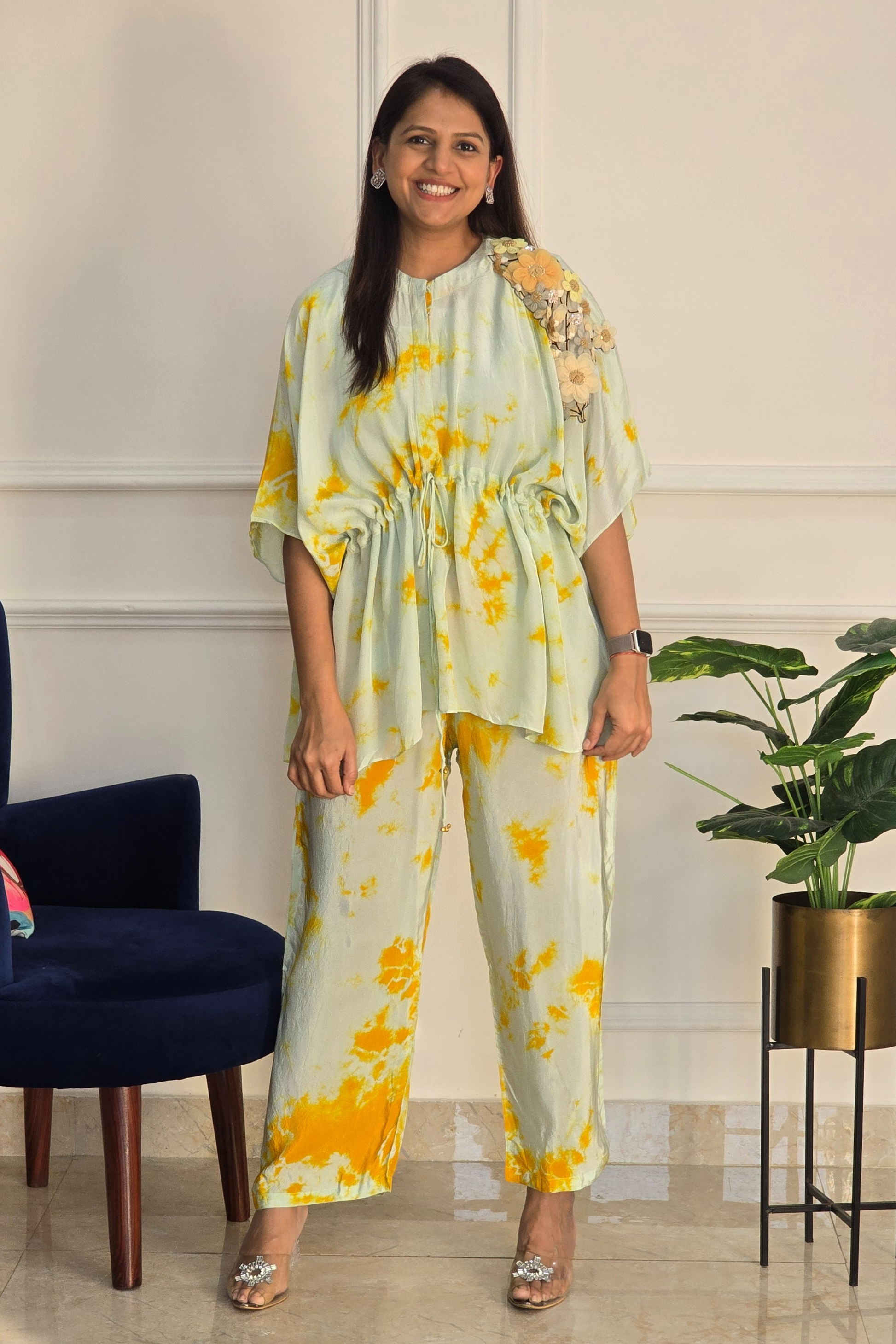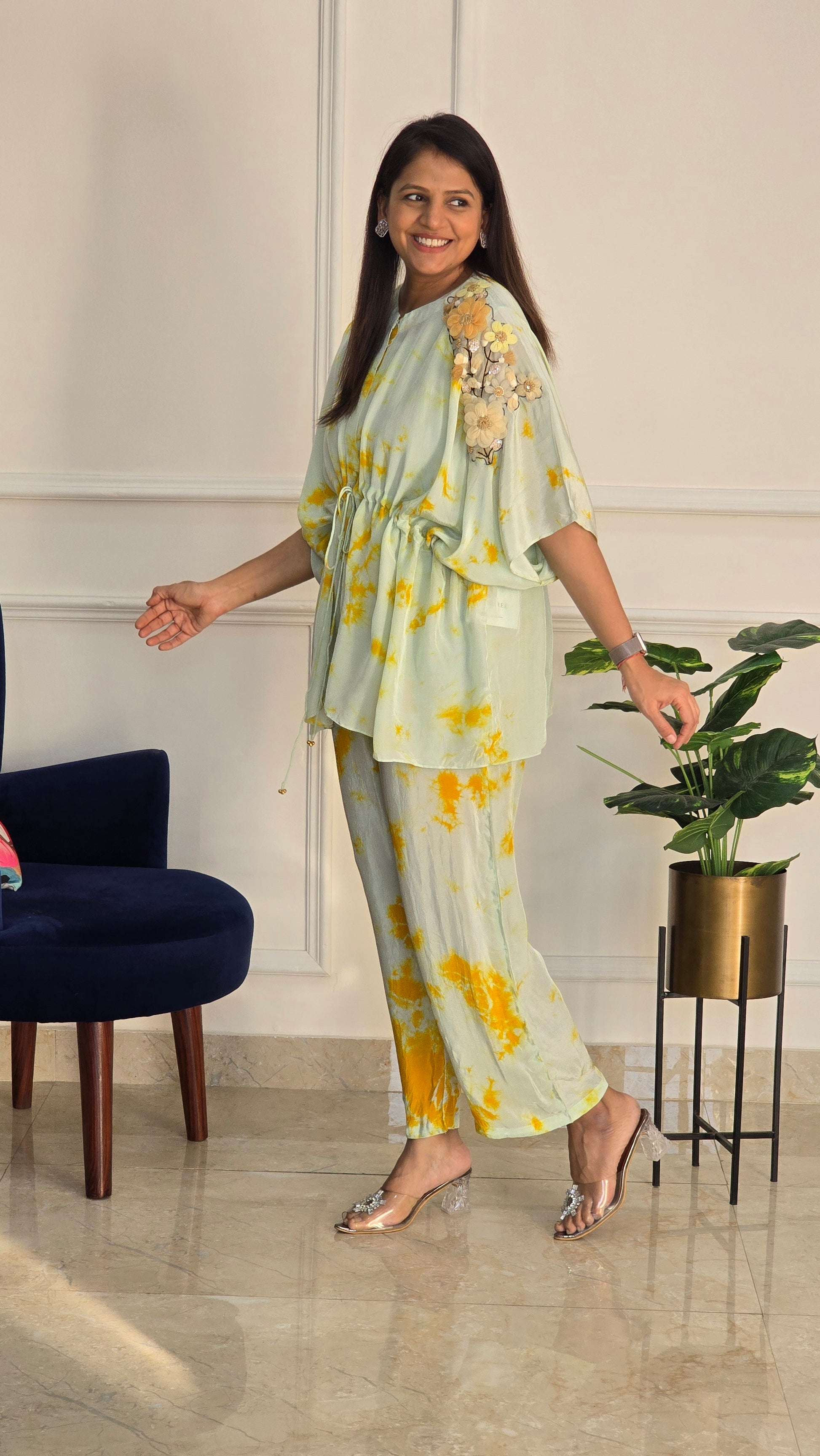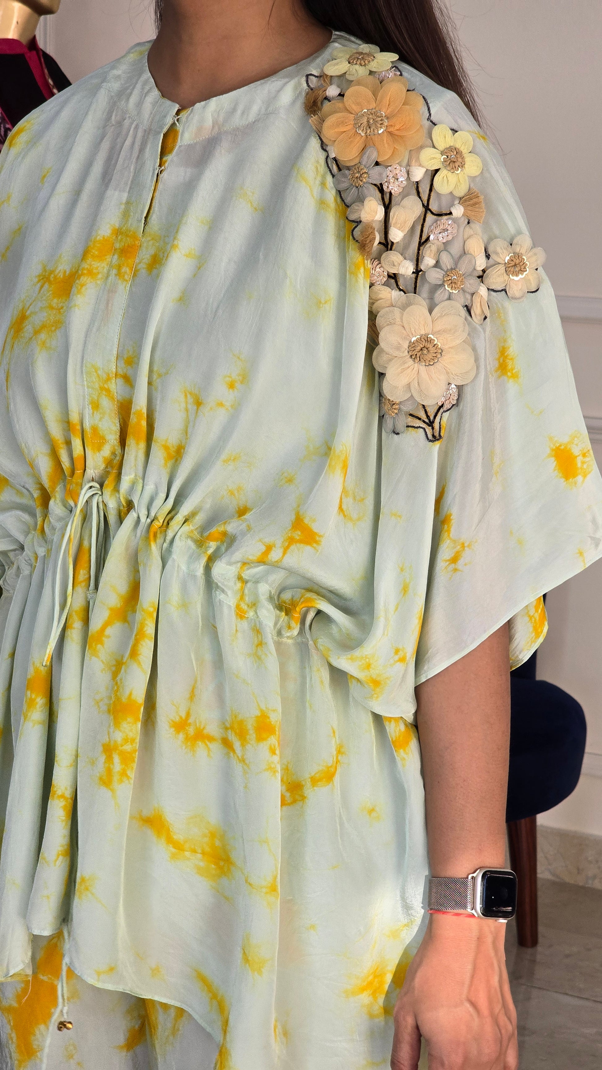 Seen here is pure crepe tie and dye set with 3D handwork on shoulder comes with string to give it a kaftan fit look !