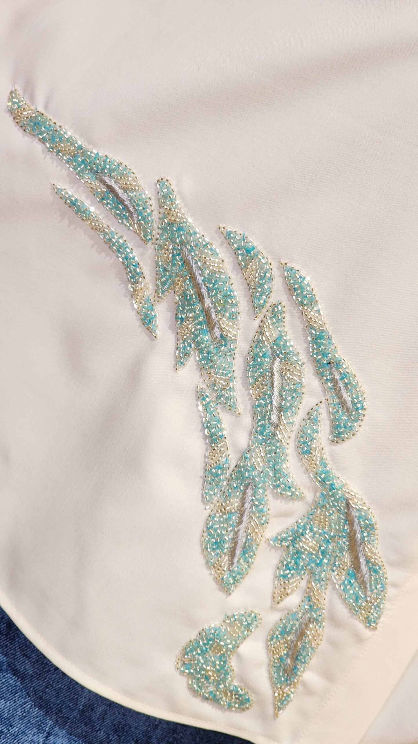 Seen here is Boxy fit Shirt on cot look denim fabric with hand embellishments ! Pair it up with your favourite Pants or jeans ! Note : This is Only Top