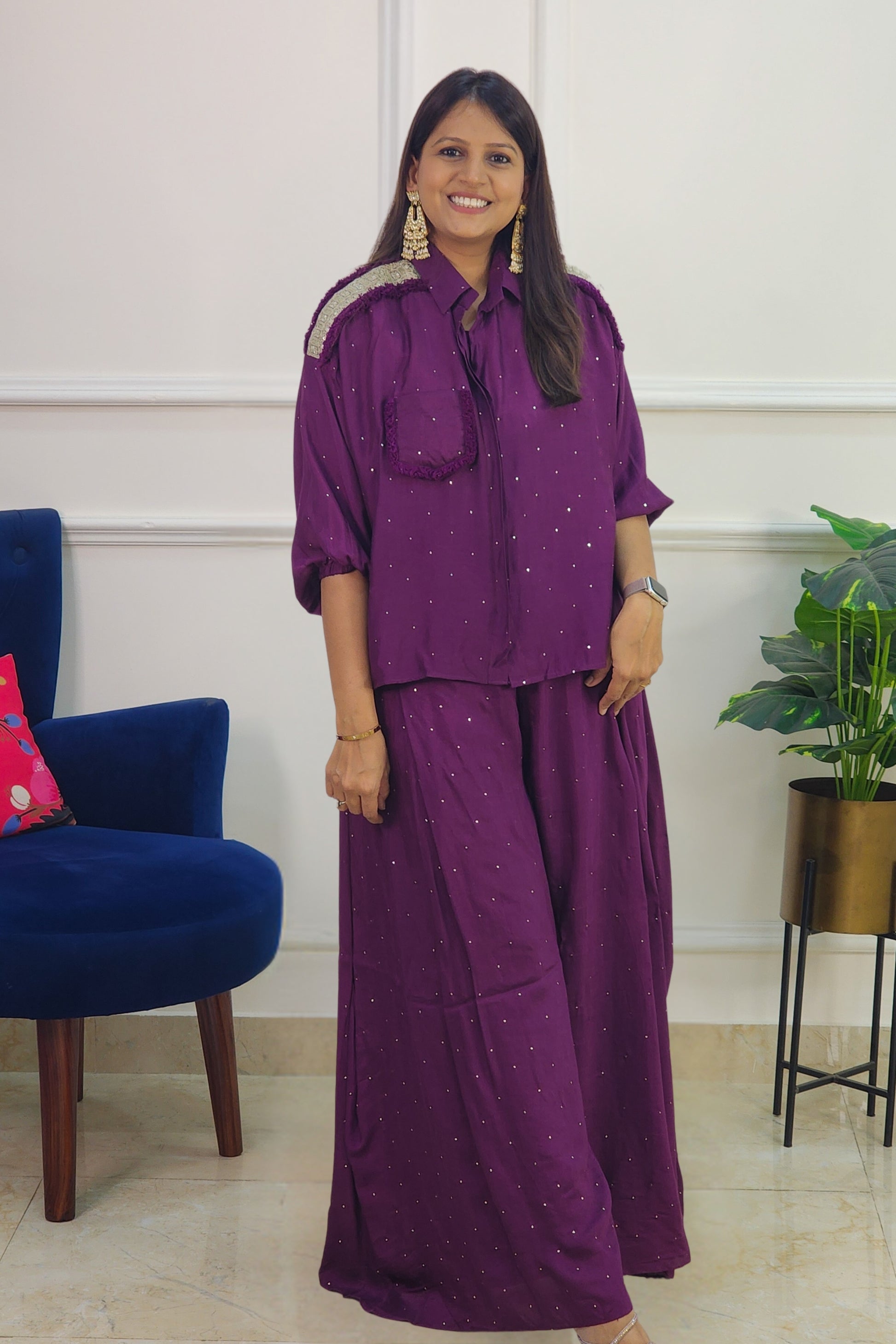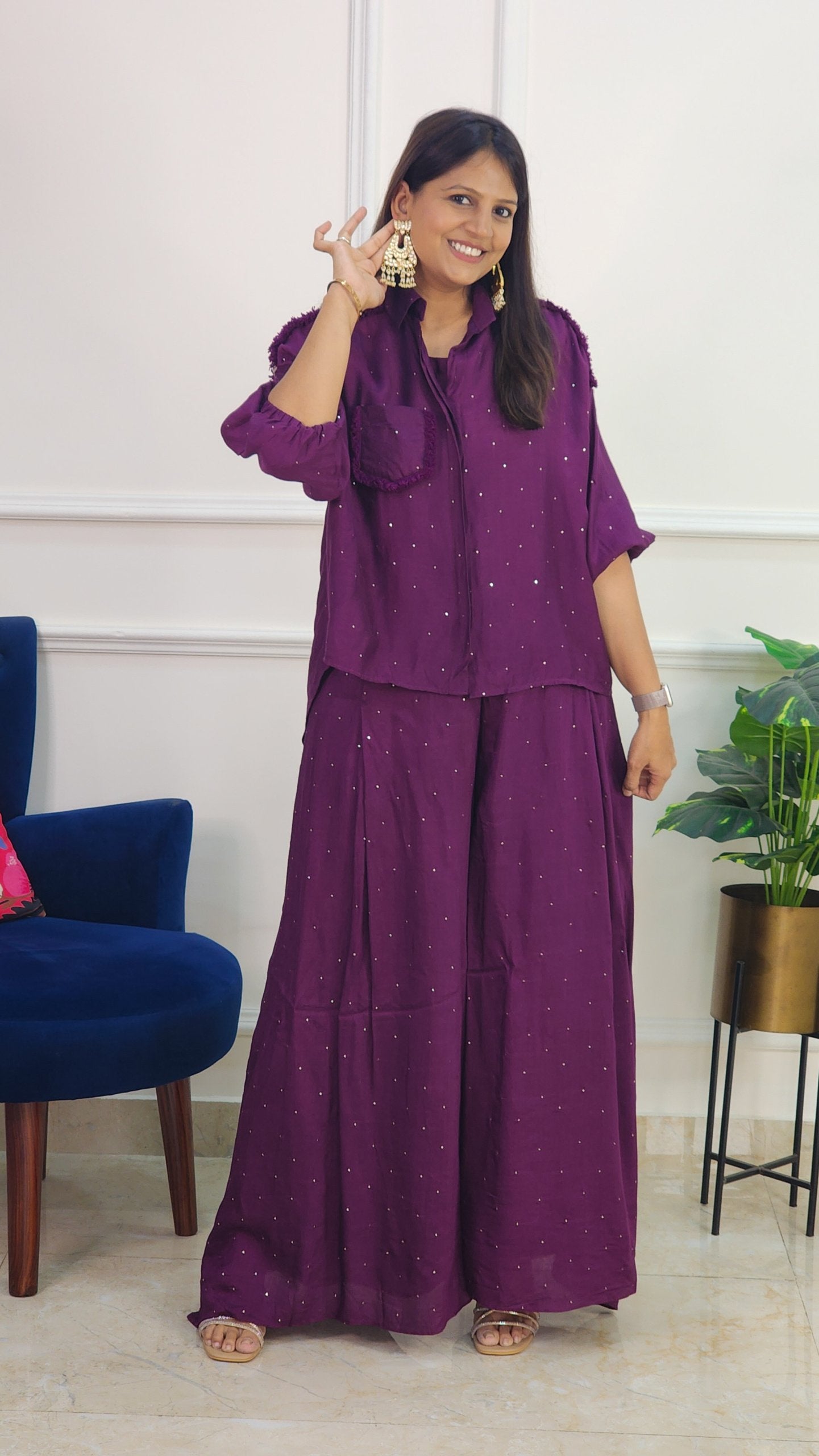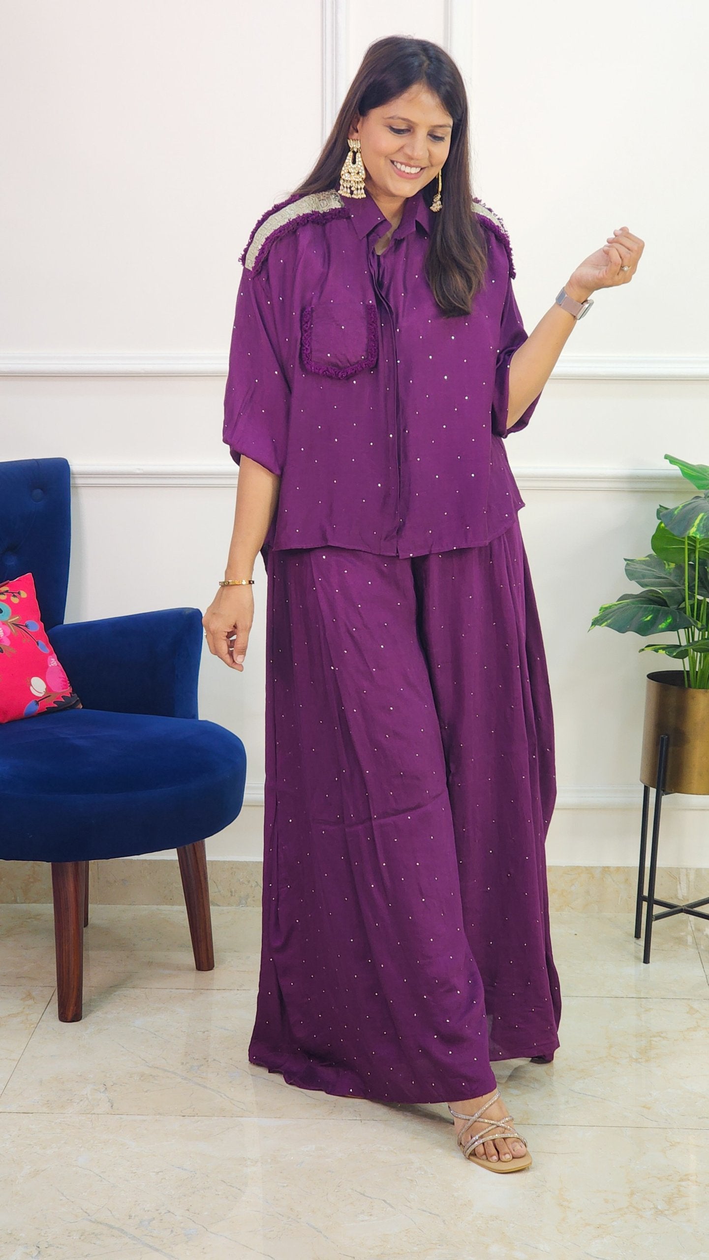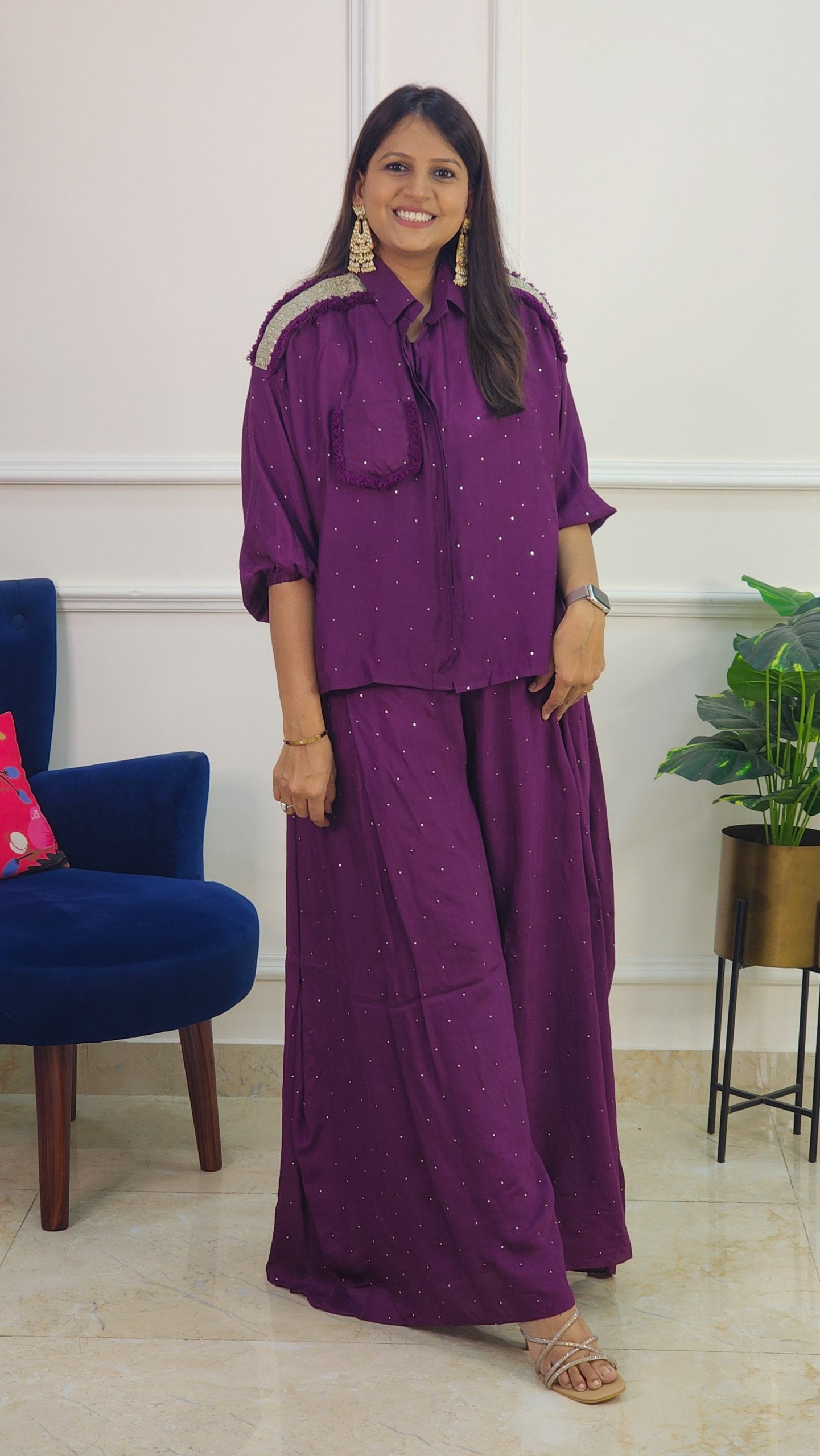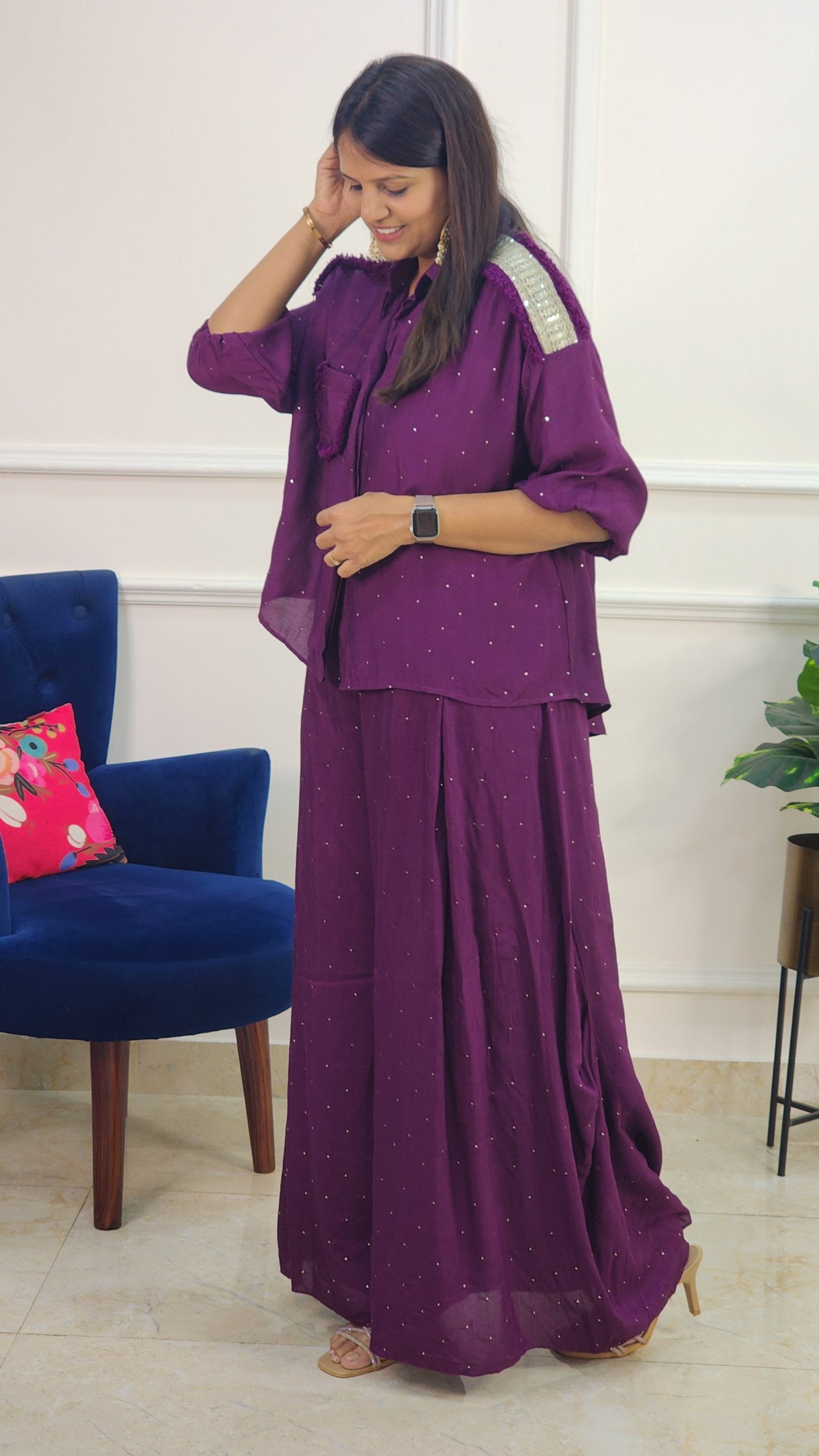 Seen here is co ord set with mukesh handwork done all over and lace detailing on shoulder !