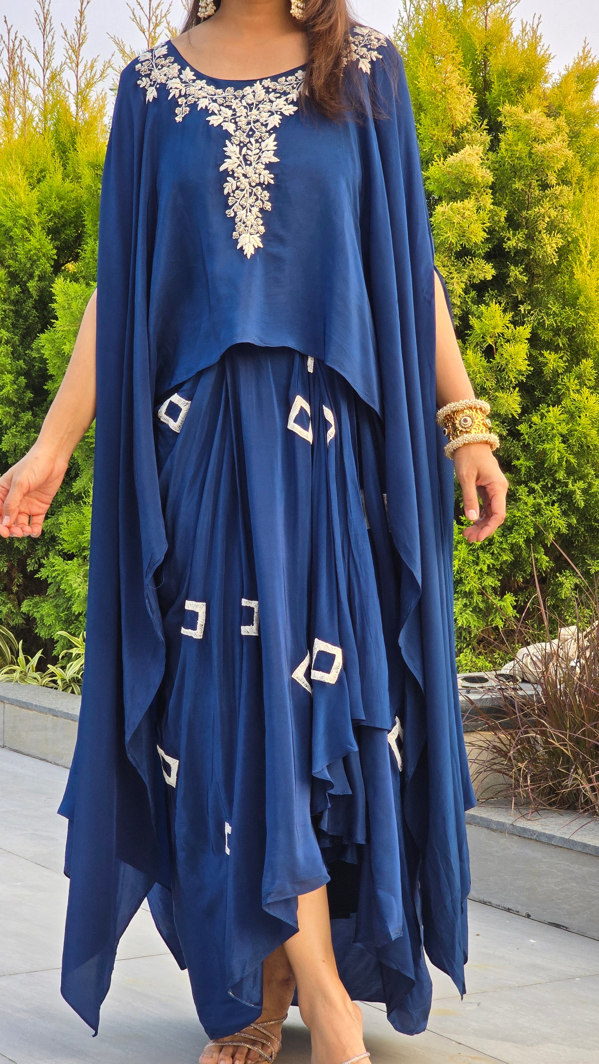 A flowy blue indo-fusion set featuring delicate embroidery and a modern draped silhouette. Elegant and comfortable.